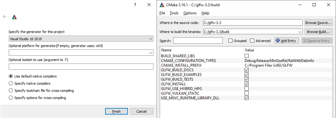 CMake kurulduktan sonra onu komut satırından veya GUI’den çalıştırmayı seçebilirsiniz. İşleri karmaşıklaştırmaya çalışmadığımızdan GUI’yi kullanacağız. CMake, binary dosyalar için bir kaynak kod klasörüne ve bir hedef klasöre ihtiyaç duyar. İndirilen GLFW kaynak paketinin kök klasörünü, kaynak kod klasörü olarak seçeceğiz ve ve build klasörü için yeni bir build dizini yaratıyoruz ve sonra bu dizini seçiyoruz.