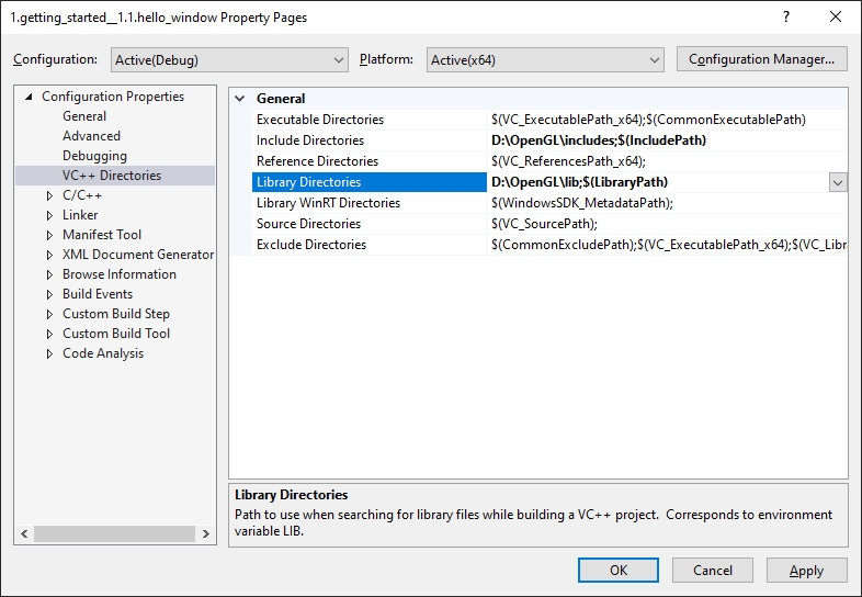 Projenin GLFW’yi kullanması için kütüphaneyi projemizle bağlamamız gerekir. Bu, linker ayarlarında glfw3.lib kullanmak istediğimizi belirterek yapılabilir, ancak projemizde üçüncü parti kütüphaneleri farklı dizinlere yapıştırdığımızdan beri glfw3.lib’i nerede bulunacağı bilinmiyor. Bu yüzden önce bu dizinleri projeye eklememiz gerekiyor.