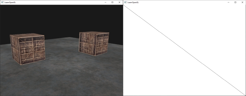 Solda, derinlik testi eğitiminde gördüğümüzle aynı olan görsel çıktı gösteriliyor, ancak bu kez basit bir dörtlü oluşturuldu. Sahneyi tel kafes içinde oluşturursak, görünür hale gelir, varsayılan çerçevede yalnızca bir dörtlü çizdik.