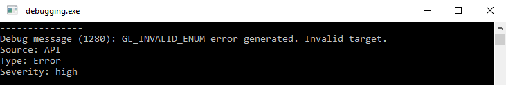 Yaptığımız yapılandırmaya ve debug output destekleyen bir context kullandığınızı varsayarsak, artık her hatalı OpenGL komutu, çok sayıda faydalı bilgiyi içeren kapsamlı bir çıktı verecektir: