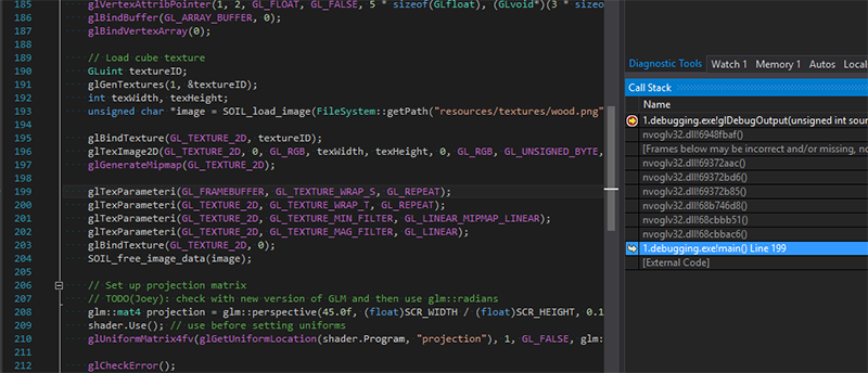 Burada OpenGL’e debug output özelliğini etkinleştirmesini söylüyoruz. glEnable(GL_DEBUG_OUTPUT_SYNCHRONOUS) çağrısı ise, bir hata oluştuğu anda OpenGL’in callback fonksiyonunu hemen çağırmasını sağlar.