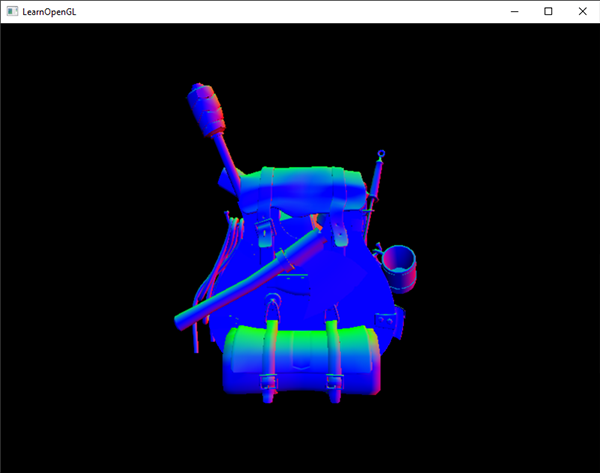 By outputting a (non-color) variable to the output color channel like this we can quickly inspect if the variable is, as far as you can tell, displaying correct values. If, for instance, the visual result is completely black it is clear the normal vectors aren't correctly passed to the shaders; and when they are displayed it's relatively easy to check if they're (sort of) correct or not: