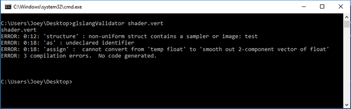 Eğer derleyici herhangi bir hata algılamazsa, herhangi bir çıktı vermez, bunu unutmayın. Bozuk bir vertex shader üzerinde GLSL referans derleyicisini test ettiğimizde ise aşağıdaki çıktıyı alırız:
